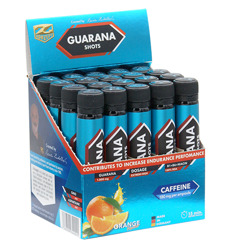 La guaranà viene ottenuta dalle semi essiccate e sbucciate della pianta Paulinia Cupana. Originariamente proviene dalla regione amazzonica. Era utilizzata da tempo dagli indigeni per sopprimere la sensazione di fame e contro la stanchezza. Questo effetto è dovuto alla caffeina contenuta in queste semi. A differenza del caffè, dove la caffeina è libera, tuttavia, la caffeina nella guaranà è legata ai tannini. Pertanto, viene rilasciata più lentamente e consente il grande vantaggio di un effetto della caffeina più duraturo. In Guarana 1.800 shot abbiamo utilizzato la migliore qualità di guaranà per elevati livelli di caffeina e il miglior sapore. La forma liquida consente un avvio più rapido rispetto a compresse o capsule, ma senza compromettere l'effetto più duraturo. Con 1.800 mg di estratto di guaranà altamente concentrato, si ottiene uno dei livelli di dosaggio più elevati sul mercato. 180 mg di caffeina con un effetto a lungo termine corrispondono a 2-3 tazze di caffè filtrato.